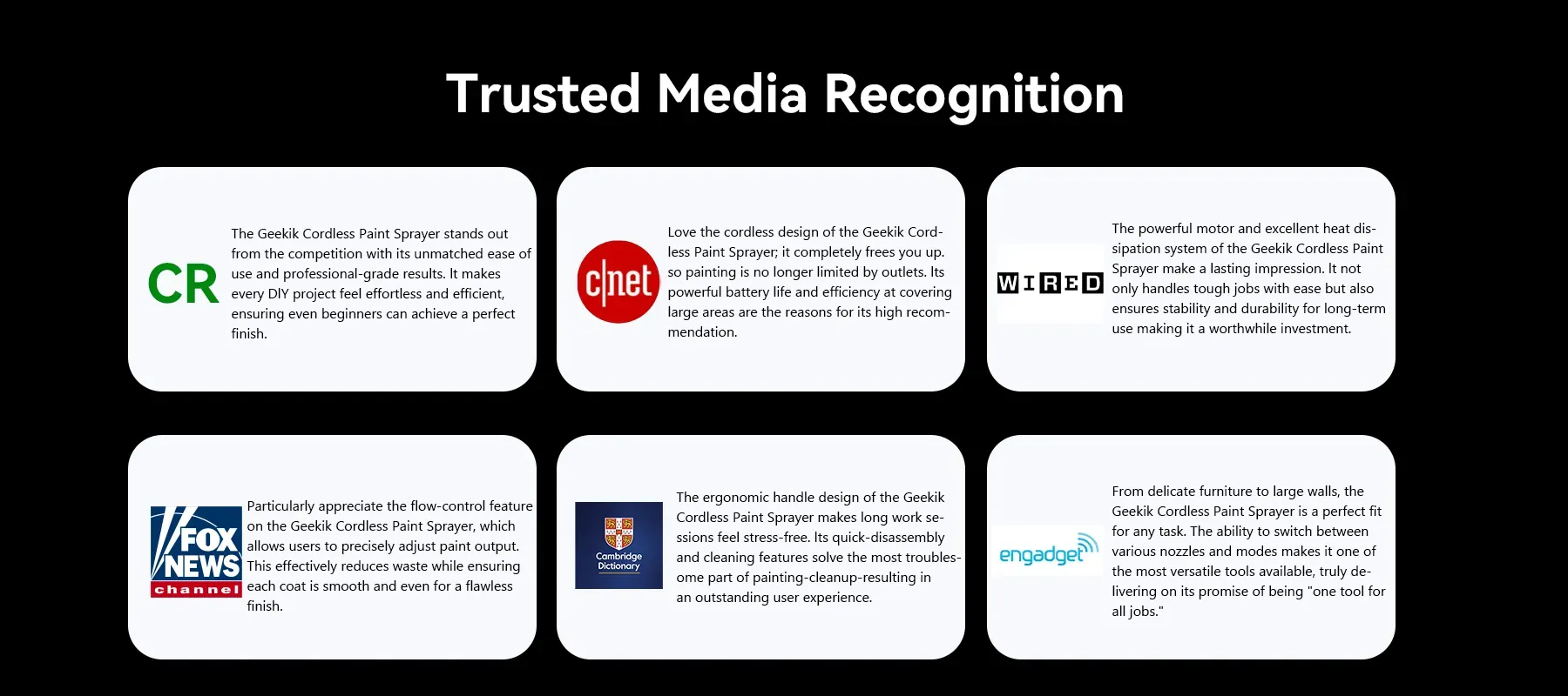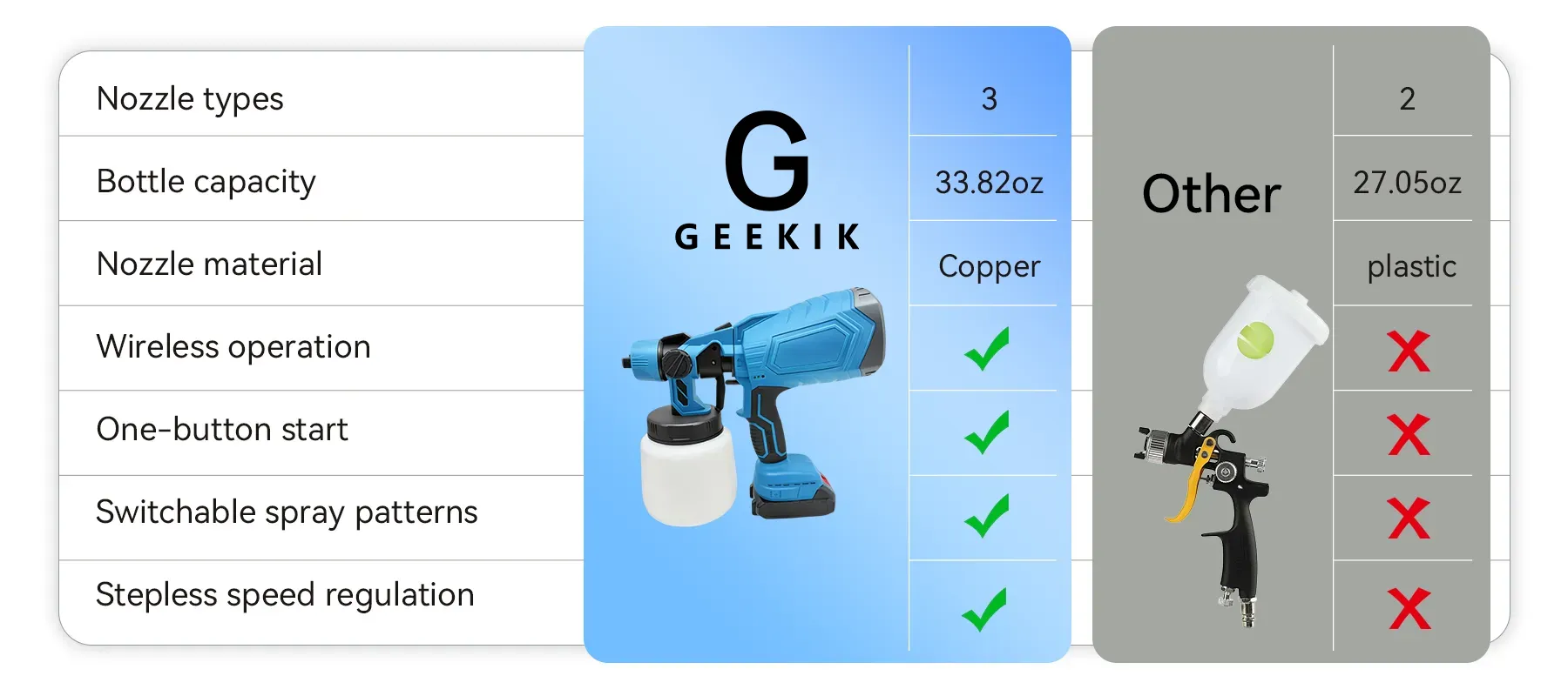 That’s how the Geekik Cordless Paint Sprayer was born. Its powerful yet user-friendly design makes spraying effortless while delivering flawless results. This reflects Geekik’s core promise: transforming tedious chores into a creative joy, so you can focus on the art of your work.